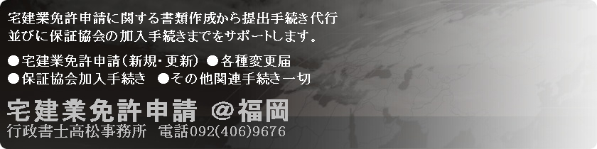 | 宅地建物取引業免許の申請代行 宅建業免許申請@福岡 宅建業免許申請(新規・更新)/各種変更届/保証協会加入 福岡県内で信頼できる行政書士をお探しならこちらです。 行政書士高松事務所(福岡市中央区大濠1-12-2-301) |